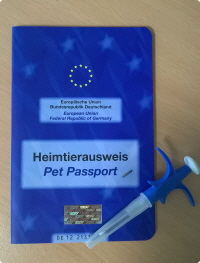 Der Heimtier-Ausweis Dieser ist Pflicht für jeden Hund, der mit ins Ausland reisen soll. Die Ausstellung und alle Eintragungen dürfen nur vom Tierarzt vorgenommen werden, denn beim Heimtierausweis handelt es sich um ein Dokument. Dieses sollte gut aufbewahrt werden! Ihr Hund erhält einen Micro-Transponder subcutan, das heißt unter die Haut, an der linken Halsseite implantiert. Die Nummer des Micro-Chips kann mit einem speziellen Lesegerät abgelesen werden und wird in den Ausweis eingetragen. Damit kann jeder Hund zweifelsfrei identifiziert werden. Desweiteren werden alle Impfungen und die speziell für manchen Länder vorgeschriebenen Entwurmungen im Pass eingetragen.
